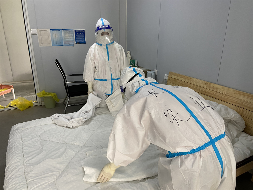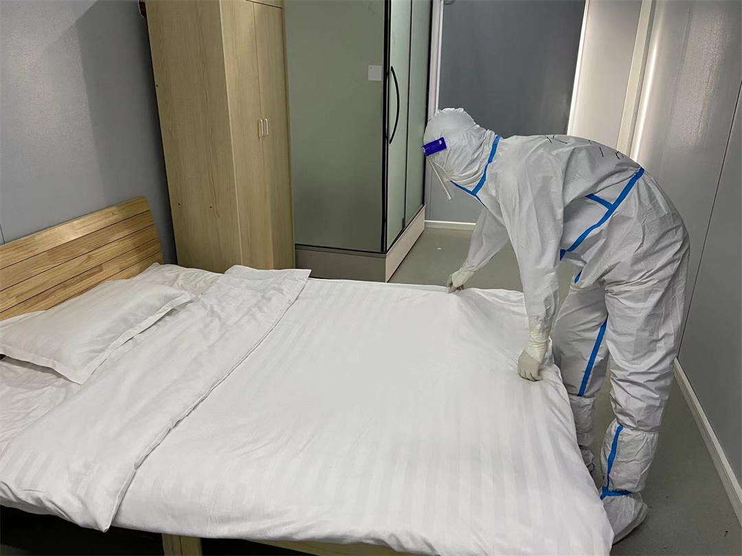 具備經(jīng)驗(yàn)的工作人員身著隔離服,整理床鋪、清洗衛(wèi)生間、清潔每一個(gè)角落、擺放好新的物品,將垃圾全部清運(yùn)到指定地點(diǎn)……整理好一個(gè)房間至少需要50分鐘。從下午1:00到晚上10:00,在大家不停歇的努力下,800余個(gè)房間全部整理完畢,煥然一新。