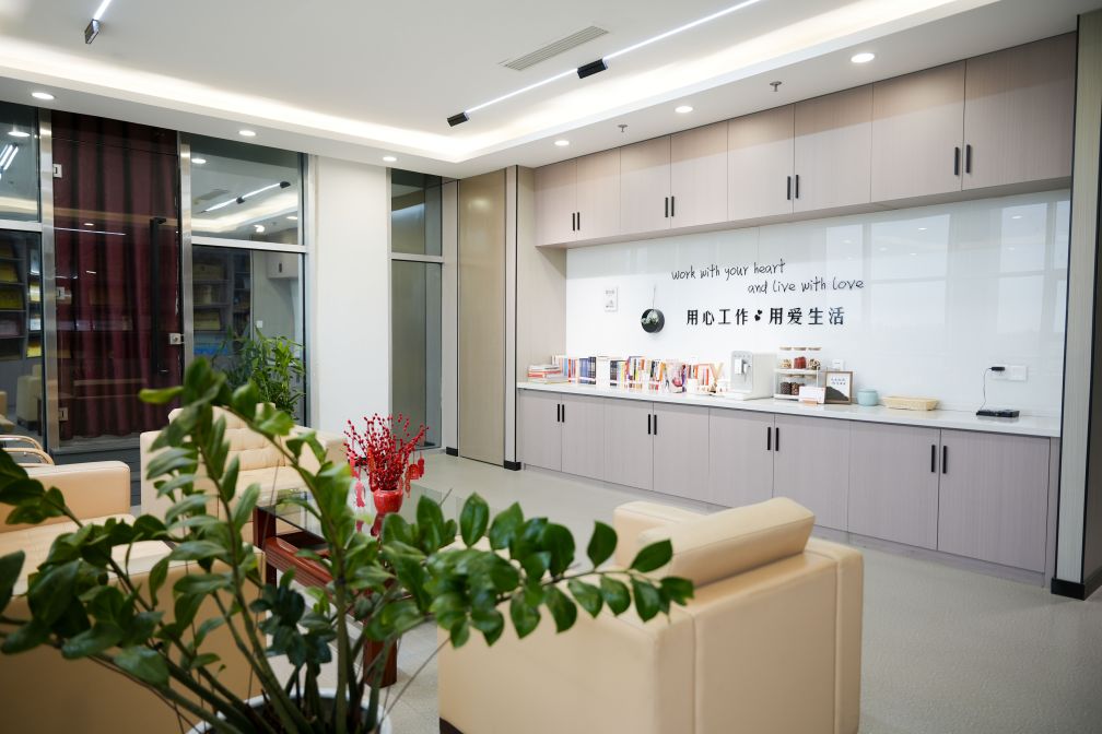 茶水間的設(shè)立不僅是促進(jìn)員工交流、放松身心的絕佳場所,更是公司文化建設(shè)與員工關(guān)懷力的承載。采用開放式設(shè)計(jì),配備儲(chǔ)物柜、咖啡機(jī)、書籍、茶歇飲品等。茶飲旁有沖泡小提示,標(biāo)明材料的搭配及作用;圖書區(qū)特意挑選了職工喜聞樂見的圖書供員工翻閱;窗戶避光設(shè)計(jì),光線柔和,配置沙發(fā)茶幾,讓員工在緊張工作之余享受喝茶、聊天、放松的時(shí)光,感受“家”的溫暖。