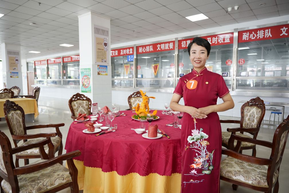 在餐廳服務(wù)員的比賽中,長田餐飲團隊所呈現(xiàn)的中餐宴會擺臺技藝卓越,創(chuàng)意層出不窮。其精心設(shè)計的龍鳳呈祥宴、聞韶養(yǎng)生宴、五谷豐登宴、福如東海宴、泉城人家宴、金榜題名宴等主題,借助桌布、餐具與臺面裝飾的巧妙搭配,生動地呈現(xiàn)在每一張餐桌上。選手們優(yōu)雅的姿態(tài)、專業(yè)的操作手法和精美的臺面設(shè)計,不僅為賽事帶來了一場視覺藝術(shù)的盛宴,更深刻地展示了中餐文化的博大精深與獨特魅力。