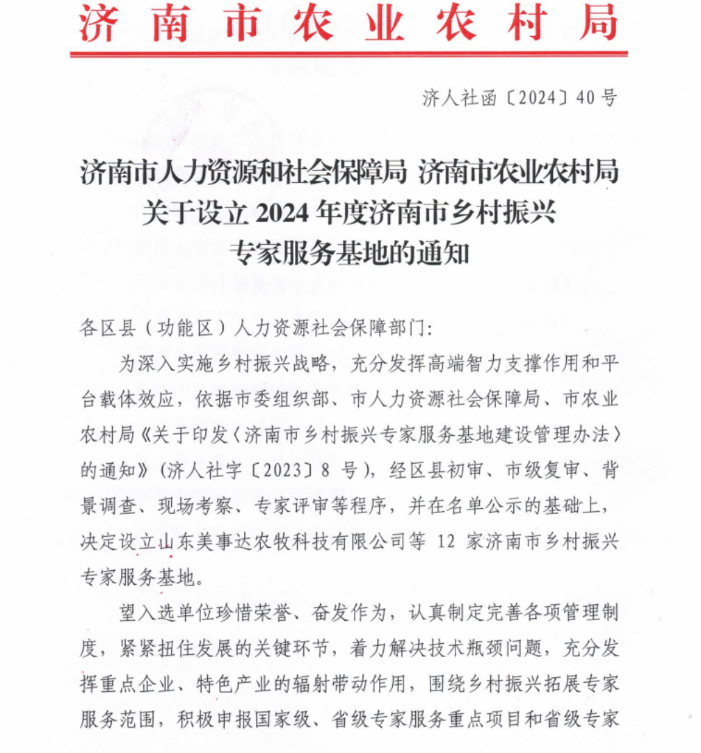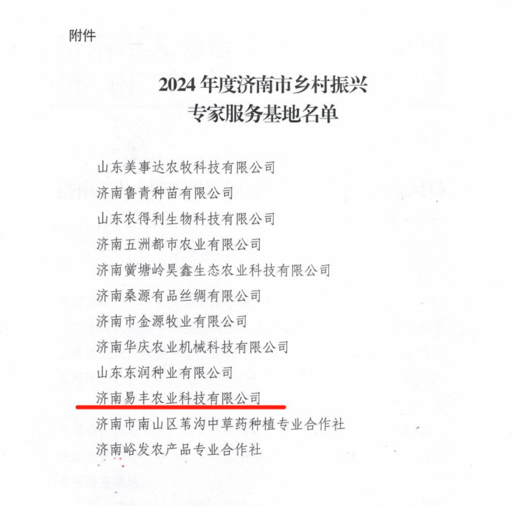 12月31日,中共濟(jì)南市委組織部、濟(jì)南市人力資源和社會(huì)保障局、濟(jì)南市農(nóng)業(yè)農(nóng)村局下發(fā)《關(guān)于設(shè)立2024 年度濟(jì)南市鄉(xiāng)村振興專家服務(wù)基地的通知》,經(jīng)過嚴(yán)格評審與層層篩選,濟(jì)南易豐農(nóng)業(yè)科技有限公司成功入選“2024年市級專家服務(wù)基地”,為專家服務(wù)鄉(xiāng)村振興提供平臺!