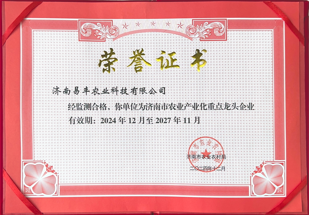 易豐農(nóng)業(yè)被授予濟南市第十八批農(nóng)業(yè)產(chǎn)業(yè)化重點龍頭企業(yè)、濟南市十佳巾幗現(xiàn)代農(nóng)業(yè)科技基地;成功入選濟南市“萬企興萬村”行動實驗項目名單;2024年,被認定為科技型中小企業(yè),并獲得市級專家服務(wù)基地、市級農(nóng)民田間學(xué)校認證。