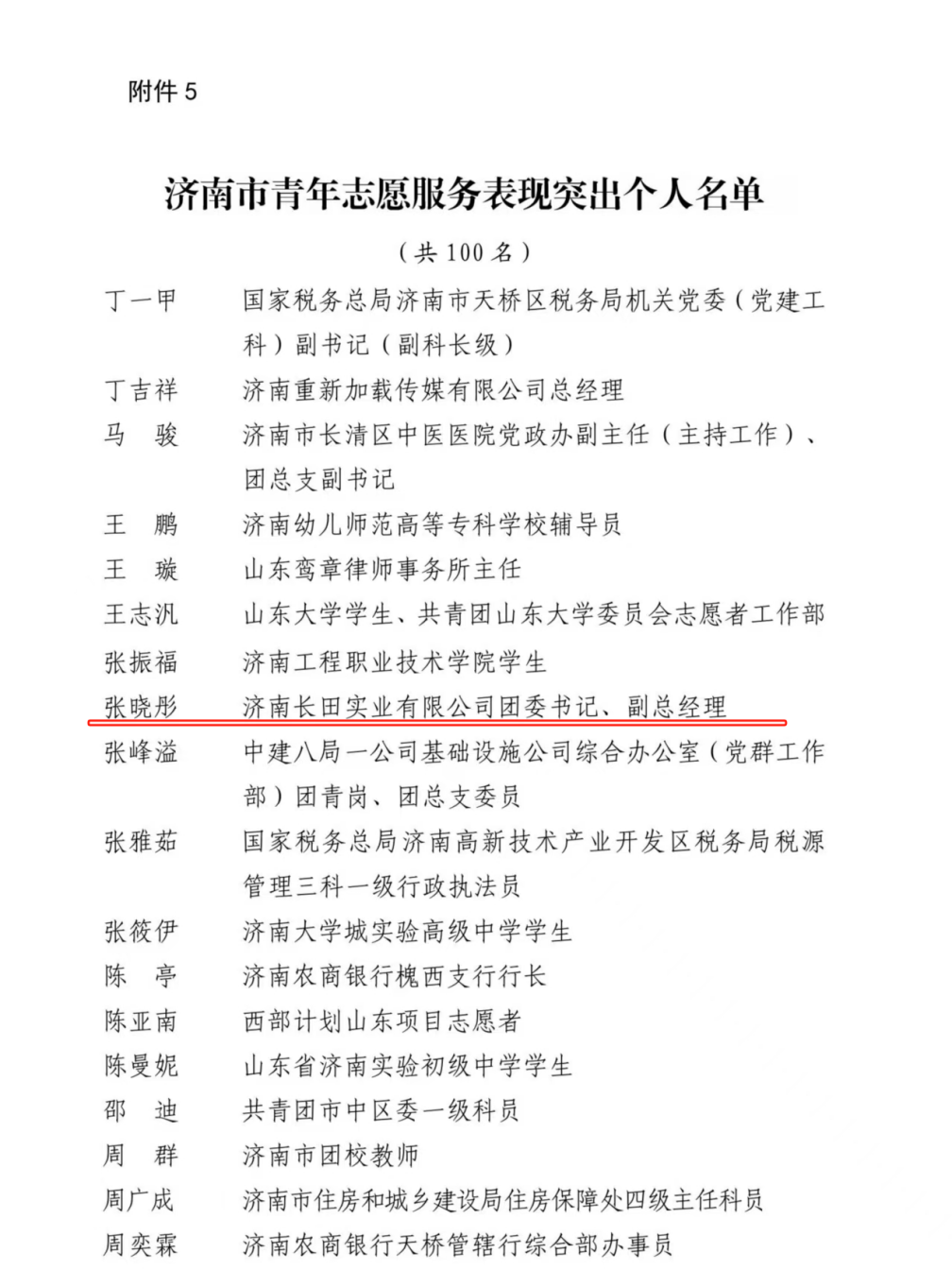 此外,在第76個五四青年節(jié)來臨之際,我們被授予了三項榮譽,長田實業(yè)團委書記、副總經理張曉彤獲評“濟南市青年志愿服務表現(xiàn)突出個人”,長田實業(yè)華百廣場團總支獲得“濟南市濟陽區(qū)五四紅旗團組織”的榮譽稱號,長田人樂善行公益服務中心青年志愿服務隊獲評“濟南市濟陽區(qū)青年志愿服務表現(xiàn)突出集體”。