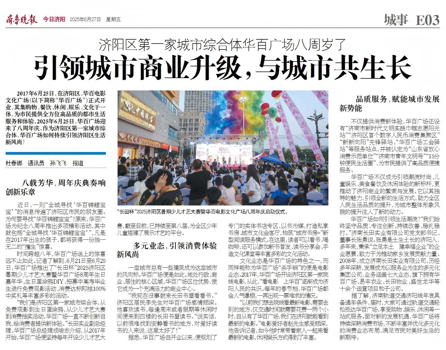 2017年6月25日,在濟(jì)陽(yáng)區(qū),華百電影文化廣場(chǎng)(以下簡(jiǎn)稱“華百?gòu)V場(chǎng)”)正式開(kāi)業(yè),其集購(gòu)物、餐飲、休閑、娛樂(lè)、文化于一體,為市民提供全方位高品質(zhì)的都市生活服務(wù)和體驗(yàn)。2025年6月25日,華百?gòu)V場(chǎng)迎來(lái)了八周年慶。作為濟(jì)陽(yáng)區(qū)第一家城市綜合體,華百?gòu)V場(chǎng)如何持續(xù)引領(lǐng)濟(jì)陽(yáng)區(qū)生活新風(fēng)尚?